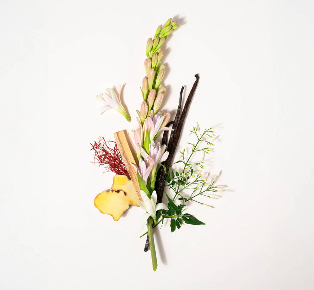 きらめきと大胆さに満ちた幕開け。鮮やかなジンジャー、みずみずしいルバーブ、眩いエレミが鮮烈に広がります。やがて気まぐれで官能的なチュベローズがジャスミンとオレンジブロッサムに溶け込み、輝くサフランのひとかけがより一層それを引き立てます。最後は、ホワイトムスク、アンブロキサン、プレシャスウッド、バニラ、キャラメルが織りなす豊かでなめらかなベースノートへと移ろい、ぬくもりと安らぎに満ちた香りの余韻を残します。チュベルーズニュイブランシュは終わりのない夜。ひと息ごとにひそやかな秘密が明かされ、永遠さえも魅了する情熱のディーバなのです。